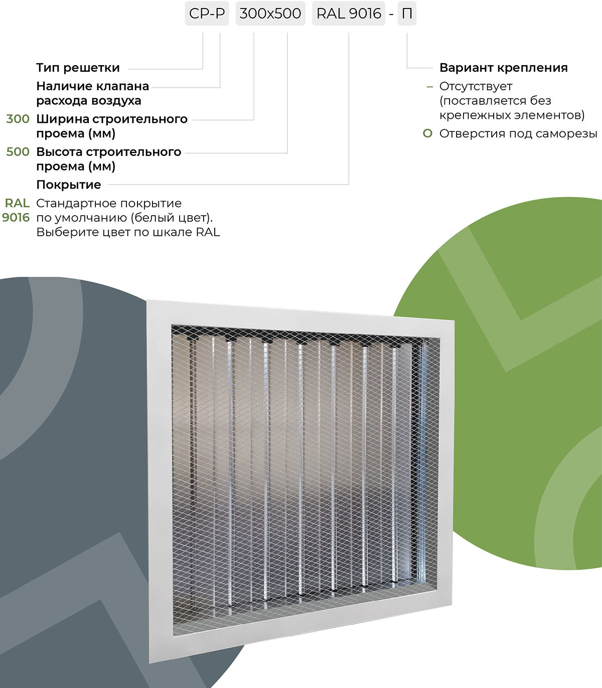 При изготовлении решеток используется запатентованный алюминиевый профиль АДЗ1 (ГОСТ 22233-2018). При производстве КРВ используется оцинкованная сталь для рамки, алюминиевый профиль для лопаток и пластиковые комплектующие (шестеренки и втулки). По умолчанию решетки окрашены полиэфирной порошковой краской белого цвета RAL 9016. По запросу возможно покрытие в другие стандартные цвета по шкале RAL. КРВ поставляется без покрытия.